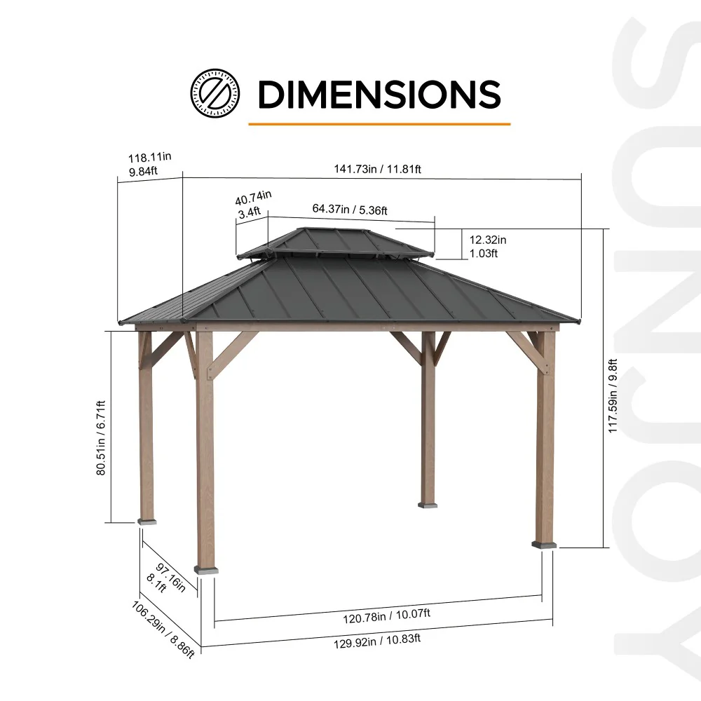 SUNJOY 10x12 Outdoor Cedar Framed Wooden Gazebo with 2-Tier Metal Roof and Ceiling Hook - Weathered Cedar