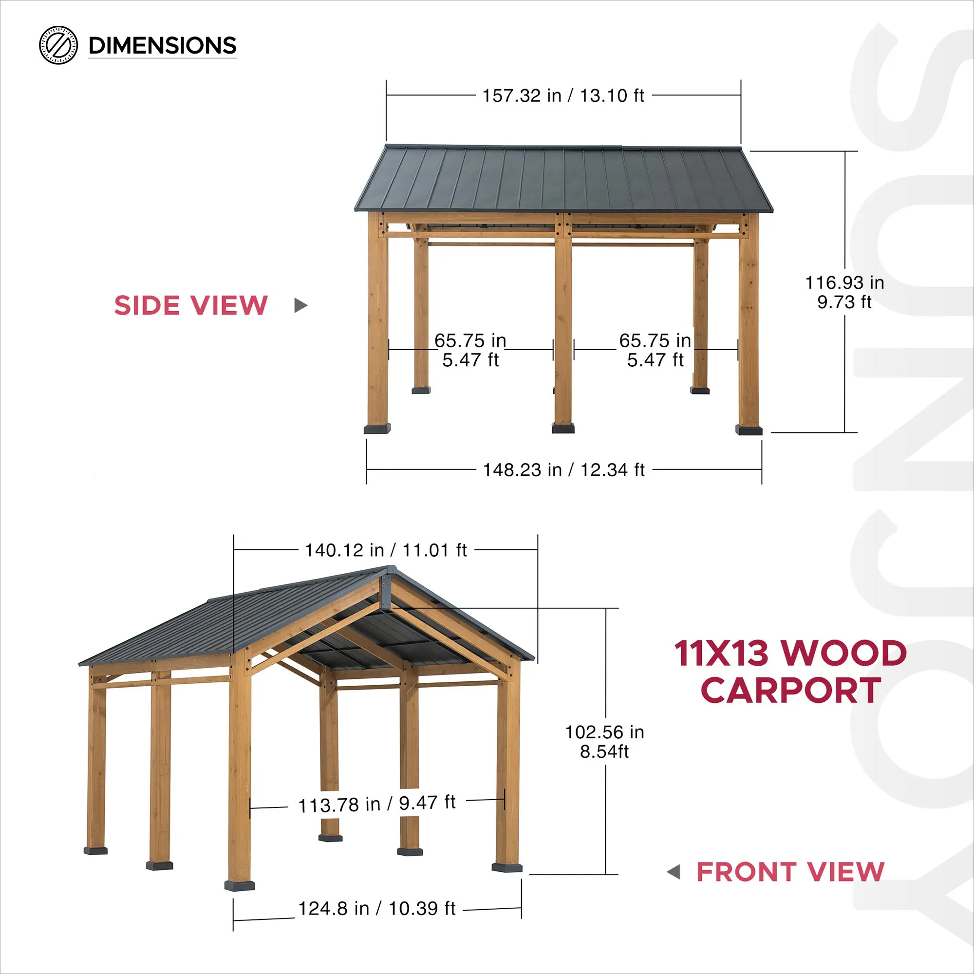 Protect your vehicles and outdoor equipment with the Sunjoy 11 x 13 ft. wood gazebo/carport. Featuring a sturdy cedar wood frame and power coated steel gable roof, this gazebo offers durable, all-season protection. It withstands up to 3,400 lbs of snow load and wind speeds up to 50 MPH, while providing 99.9% UV protection to shield your belongings from sun damage. Measuring 157.3" L x 132.1" W x 116.9" H, it offers ample space and includes ground stakes for secure installation. 2 built-in ceiling hook lets you hang lighting or decorations, making it a versatile space for work or entertaining. Easy to assemble with clear instructions and backed by responsive customer support, this wood gazebo/carport is a stylish, practical addition to your outdoor area.