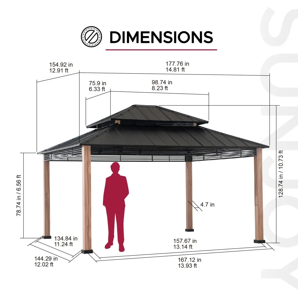 - UV Protection & Spacious Coverage: This wood and steel-roof gazebo blocks 99.99% of harmful UV rays, protecting your skin during outdoor relaxation. With 143 sq/ft. of effective shade, it’s perfect for family gatherings, backyard lounging, and outdoor entertaining.
